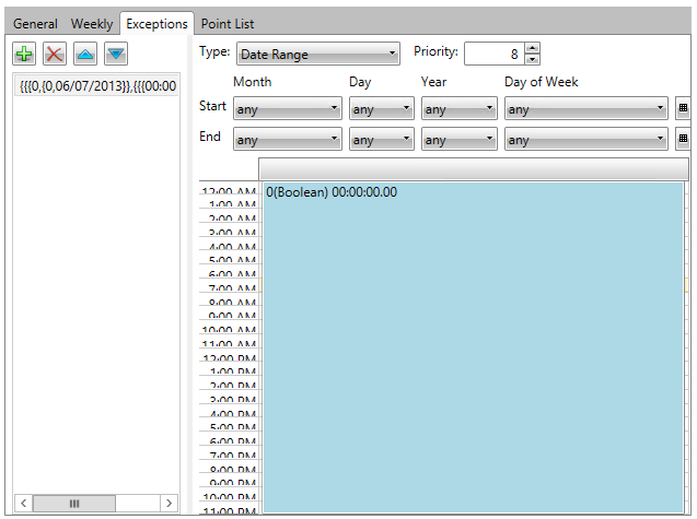 Exceptions Tab in the Schedule Control (from a BACnet Schedule View configuration) in GraphWorX64 Display Runtime with Date Range Type