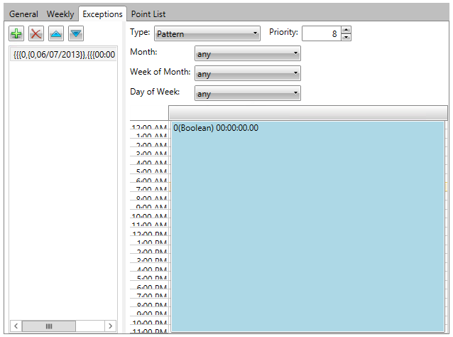 Exceptions Tab in the Schedule Control (from a BACnet Schedule View configuration) in GraphWorX64 Display Runtime with Pattern Type