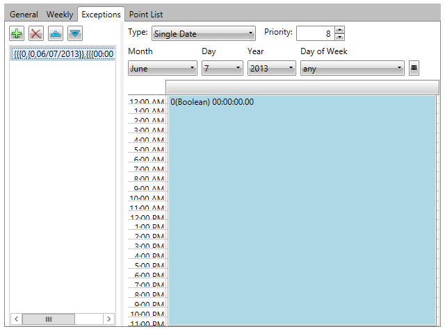 Exceptions Tab in the Schedule Control (from a BACnet Schedule View configuration) in GraphWorX64 Display Runtime with Single Date Type