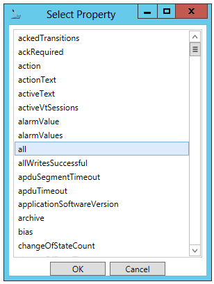Property - Enter a number in the text entry field or click on the ellipsis [...] to access the Select Property dialog box, as shown below. Once you choose a property and click OK, the corresponding number will appear in this field.