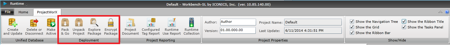 The Deployment section of the ProjectWorX Ribbon allows users to utilize packages of projects for future use, potentially on the same or different machine(s), for Runtime use or for further Configuration.
