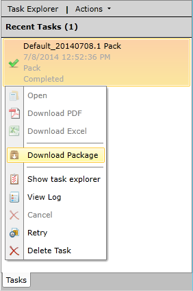 Right-click Options for a Pack Task in the Tasks Panel