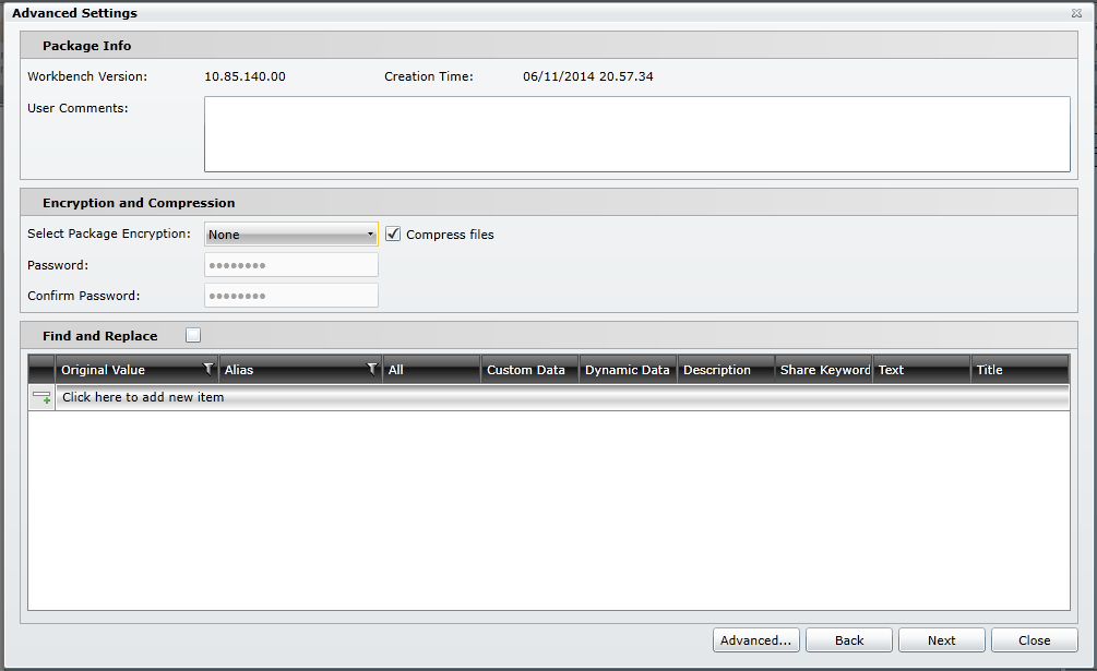 Click here to add new item - Click on this to add a new item for search and replacement in the packed project. For each value to be replaced, enter an Original Value and Alias, and then specify properties where replacements are to be made by selecting from All, Custom Data, Dynamic Data, Description, Share Keyword, Text, and/or Title. These properties are described in the table below. Once you start to edit one row, a new row will appear beneath it. The log file that is created after packing and unpacking will show you what strings were replaced. Once you have finished making your entries, click Next.
