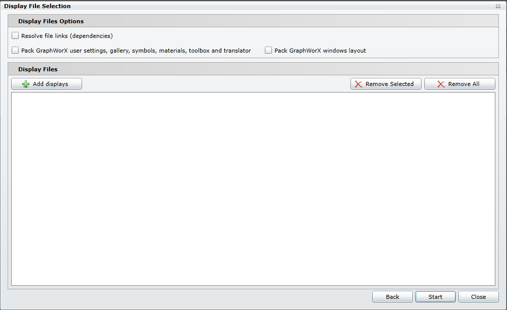 Add displays - Click this button to launch a file browser, allowing you to navigate to display files that you would like included with your packed project.