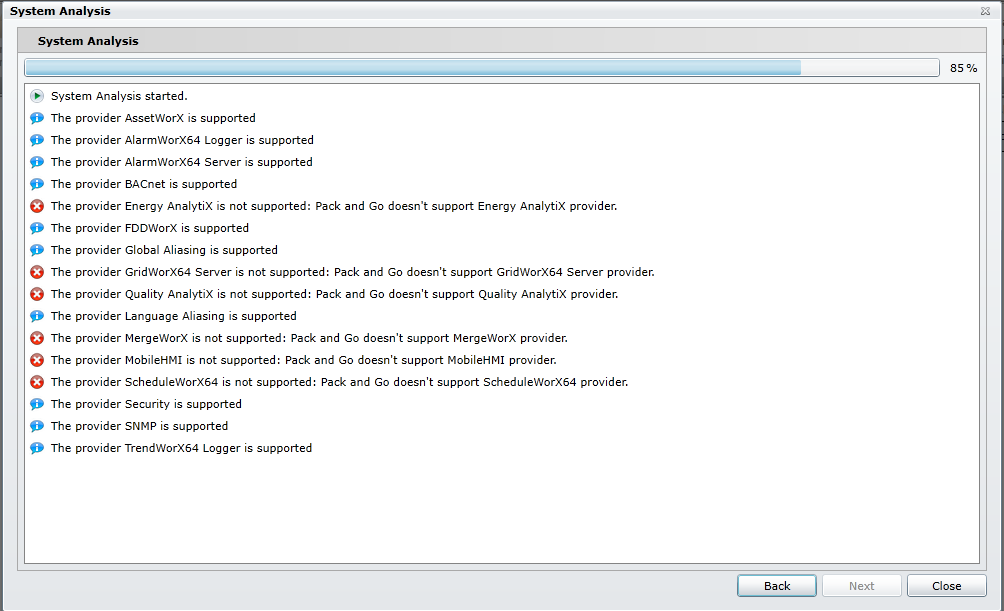 The System Analysis screen appears. You will see a listing of the providers contained in your project that are, or are not, supported, as shown below. Review the analysis results, then click Next to continue. At this point in the wizard, you may also click on the Back button to change any previously made settings.