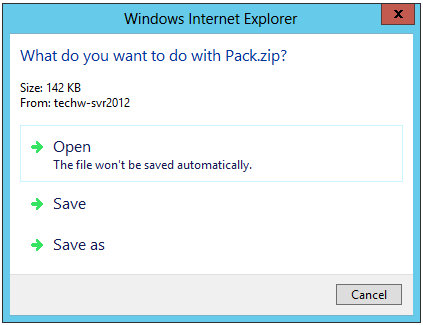 You can select to Download Package, as shown above. The following window appears, as shown below. You have the option to Open the file directly into the Workbench (Note: The file won't be saved automatically.). You can Save the file with the currently set file name in the default location or click on Save as in order to set your own file name and destination. Once saved, the packed file is now able to be unpacked for future use.