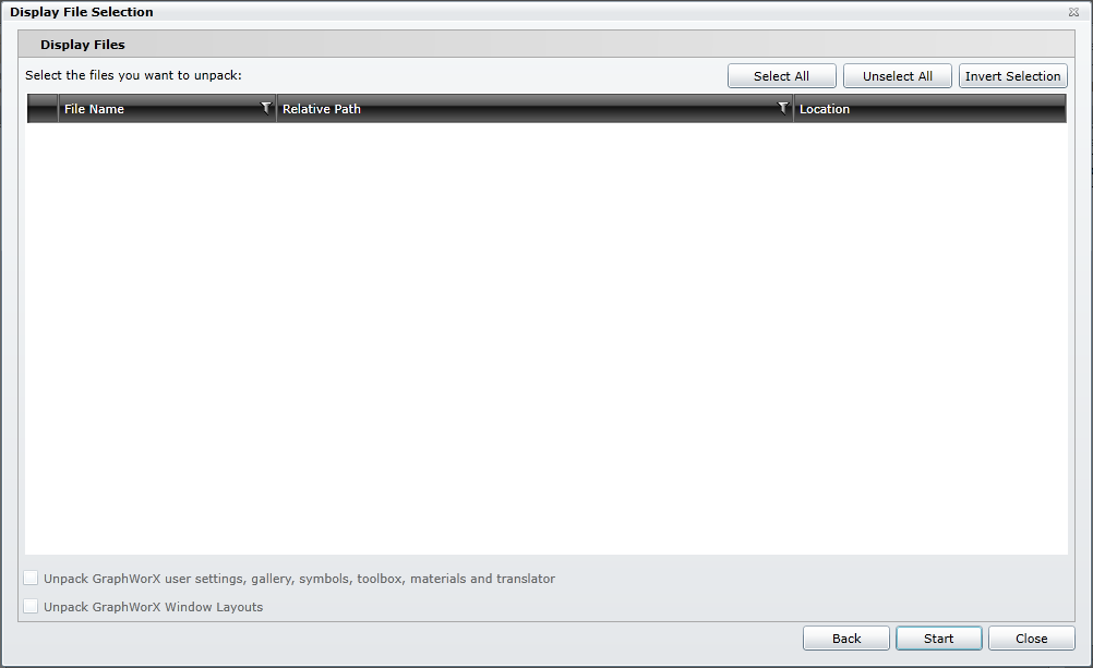 Unpack GraphWorX user settings, gallery, symbols, materials, toolbox and translator - Click this checkbox to include GraphWorX components (user settings/gallery/symbols/materials/toolbox/translator) in your unpacked project.