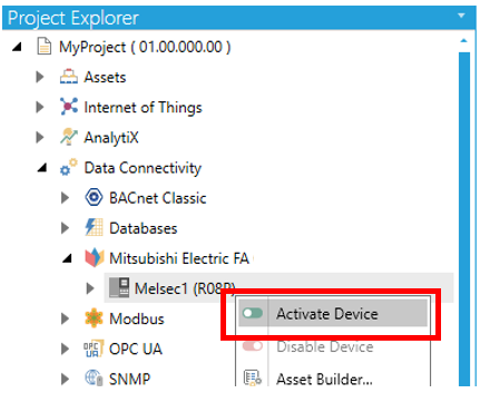 4. Right-click on the generated "Mitsubishi Electric FA" device and click on "Activate Device". This enables the "Mitsubishi Electric FA" device to communicate.