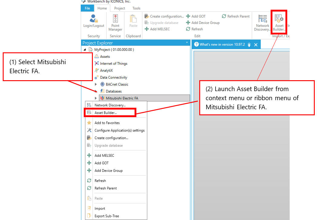 1. Launch Asset Builder from the Mitsubishi Electric FA context menu or ribbon menu.