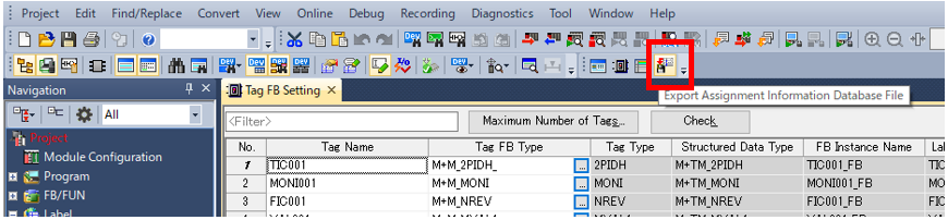 1. Open the GX Works3 project (. gx3) with the Process Automation “Tag FB settings” button as defined.