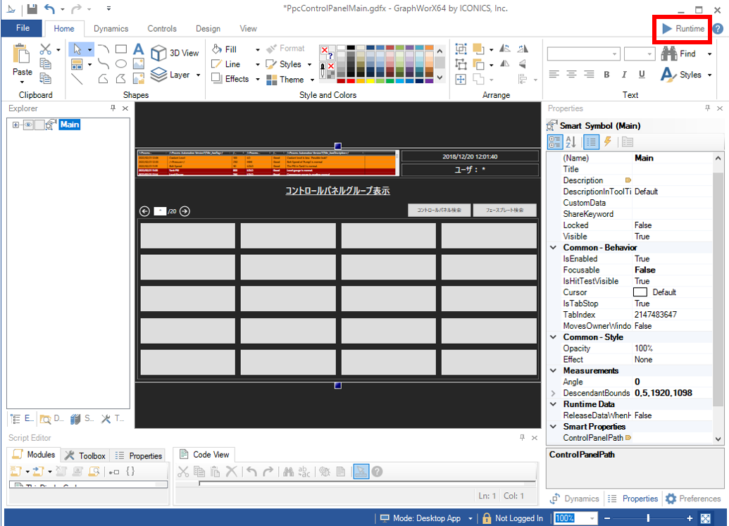 1. Open the Control Panel Main Screen (“PpcControlPanelMain.gdfx” file in the “ControlPanel” folder generated in the specified path at "Project Output Folder" in Asset Builder setup window). Run “Runtime”.