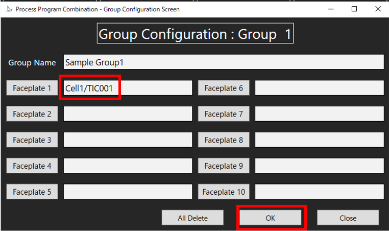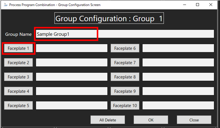4. In "Group Configuration" screen, in "Group Name" entry area, enter the desired group name and press “Enter”. After that, click on “Faceplate” button in “Group Configuration” screen. The following dialog shows an example of working with the “Faceplate 1” button.