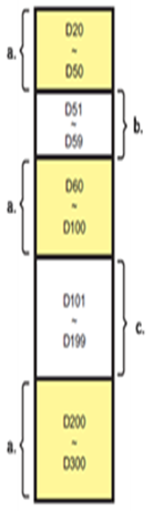 When monitoring tags for which the inconsecutive registers are set: The registers set for a tag to be monitored: D20 to D50, D60 to D100, D200 to D300