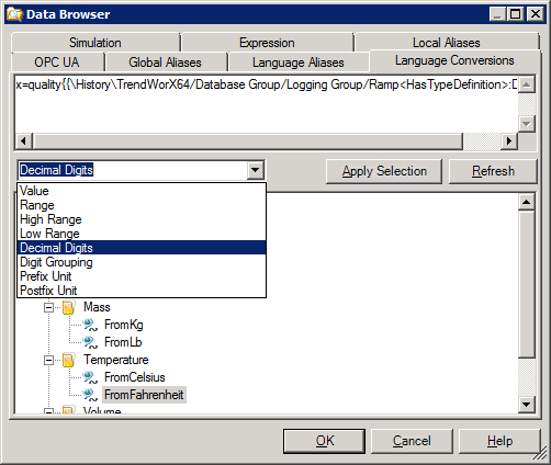 The value of the data point is taken from the data source, while the unit binding provides the required lookup to conversions in different languages to be used by the unit conversion function. The Data Browser formats your data point and units of measure selection appropriately putting in the correct paths (e.g., Temperature\FromFarenheit) and formatting.