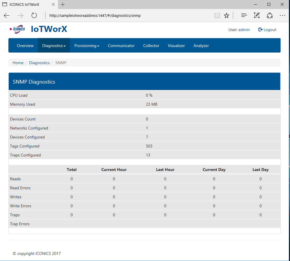 The SNMP page of the IoTWorX Diagnostics, shown below, provides multiple statistics on the SNMP data connection.
