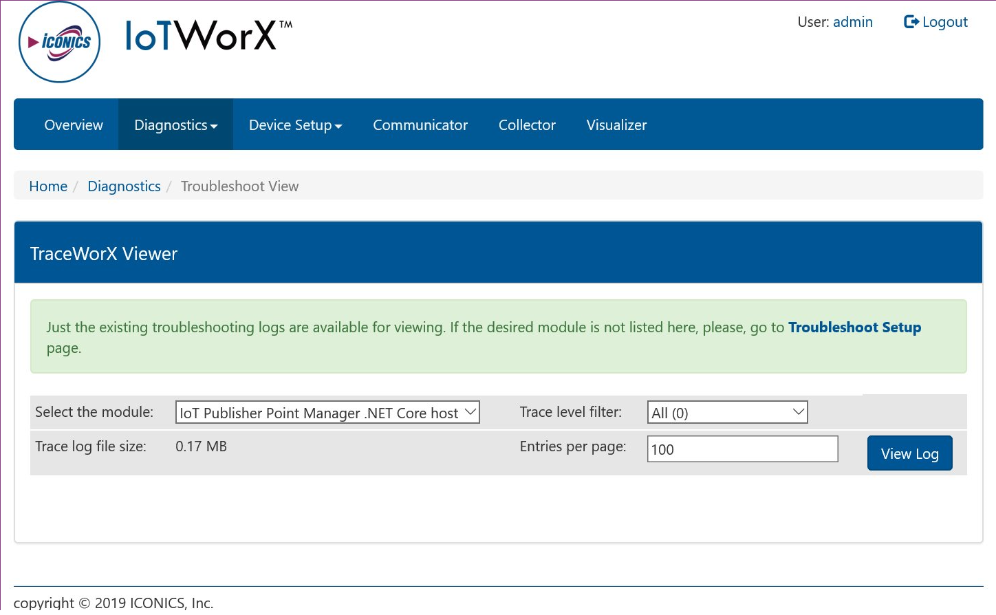 The Troubleshoot View selection, shown below, from the Diagnostics tab in IoTWorX, is similar to the functionality provided by ICONICS TraceWorX utility within its GENESIS64 HMI/SCADA suite. It allows users to view any existing troubleshooting logs configured through Troubleshoot Setup.