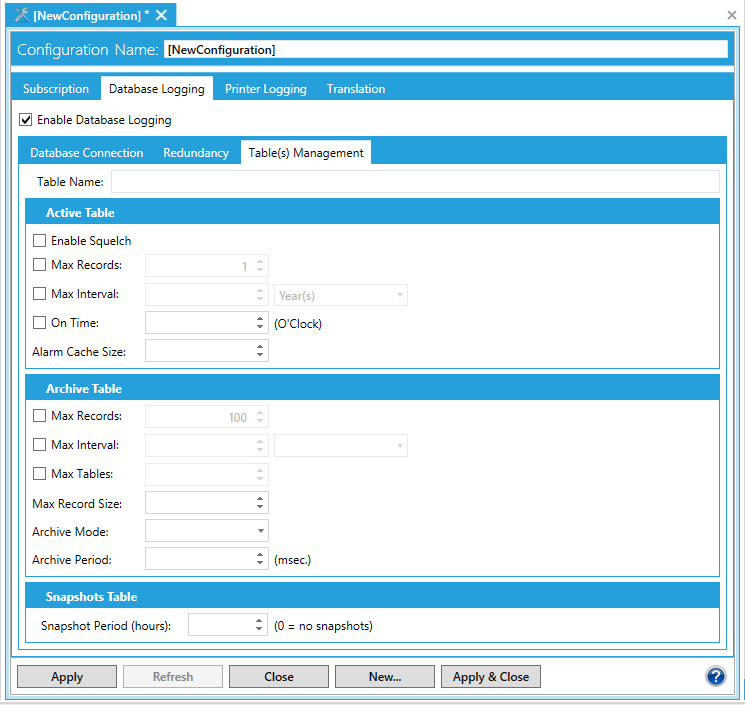 Note: If, in the Archive Table(s) section, the Max Records and Max Interval fields are both left unchecked, then all archiving will go to one archive table of theoretically unlimited length, as no restrictions have been placed on the table size. In essence, the Max Tables field will be ignored. |