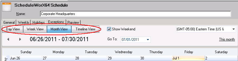 In the ScheduleWorX64 configurator, the Day, Week, Month, and Timeline Views alter the time period intervals that display in the Calendar control. These tabs (indicated) only appear when you select either the Exceptions or Preview tab.