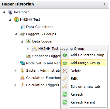 Create a new Hyper Historian Merge Group under the Logging Group. Right-click on the Logging Group and click on Add Merge Group or select the logging group and click on the Add Merge Group button from the Edit section of the Home ribbon in the Workbench.
