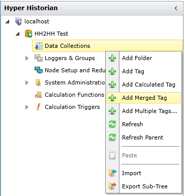 Create a new Hyper Historian Merged Tag by right-clicking on the Data Collections branch of the Hyper Historian tree explorer and then clicking on Add Merged Tag or select the Data Collections branch and then click on the Add Merged Tag button from the Edit section of the Home ribbon in the Workbench.