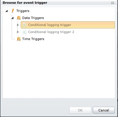 External Trigger - You can enter an external trigger in the text entry field or click on the ellipsis button [...] to open the Browse for event trigger window, as shown below. Make your selection then click OK to return back to the Hyper Historian Merge Group window.