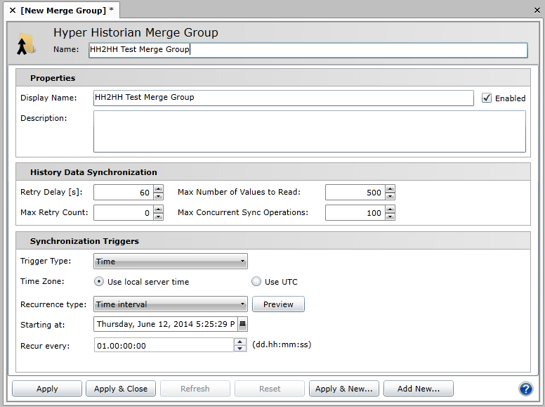 Once you have completed making your changes to the Hyper Historian Merge Group window, click on Apply or Apply & Close to save your settings.