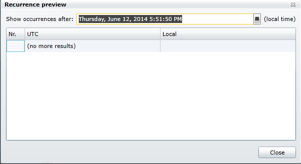 Preview - Clicking this button opens the Recurrence preview window, as shown below.