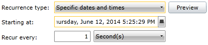 Recur every - Enter a number of units in the text entry field and click on the pulldown menu to select from Second(s), Minute(s), Hour(s), Day(s), Week(s), Month(s), or Year(s). Dependent on the units selected, the form will update in order for you to enter specific times, specific days, etc.
